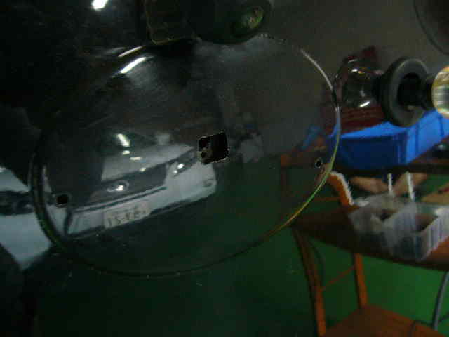 エンブレム裏のモッコリ部をかわすようにボディに穴をあけます。