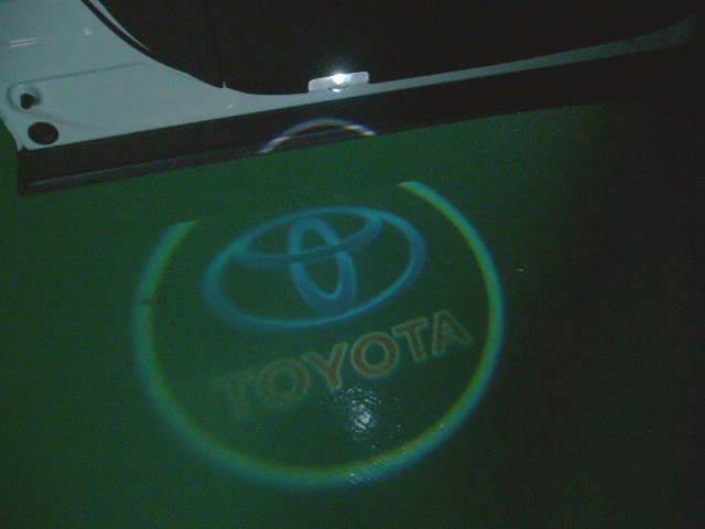 ちょっとうちのRXにつけるとドアがランプ面に張り出してるので上面が若干ドアに写り込んでしまいますがこんな感じにカラーで地面にトヨタマークを映してくれます。
