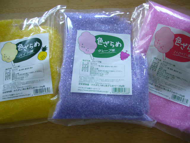 5月5日にお客さんに作る綿あめのザラメですよ。 白の綿あめではなくてグレープ、パイン、ストロベリーから選んでね…